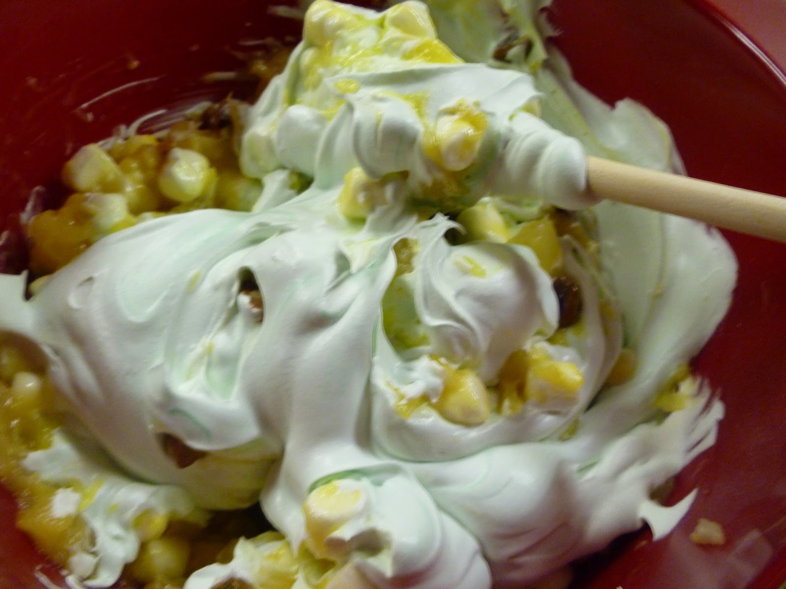 It's sweet and loaded with pineapple (for you pineapple lovers). I didn't have any pistachio pudding so I substituted vanilla pudding and adding 2 drops of green food coloring to my Cool Whip. (you could add more color with a few more drops).