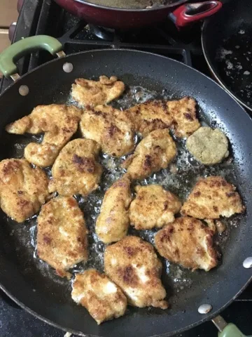 In a bowl mix a few eggs, in a zip lock bag put seasoned breadcrulmbs