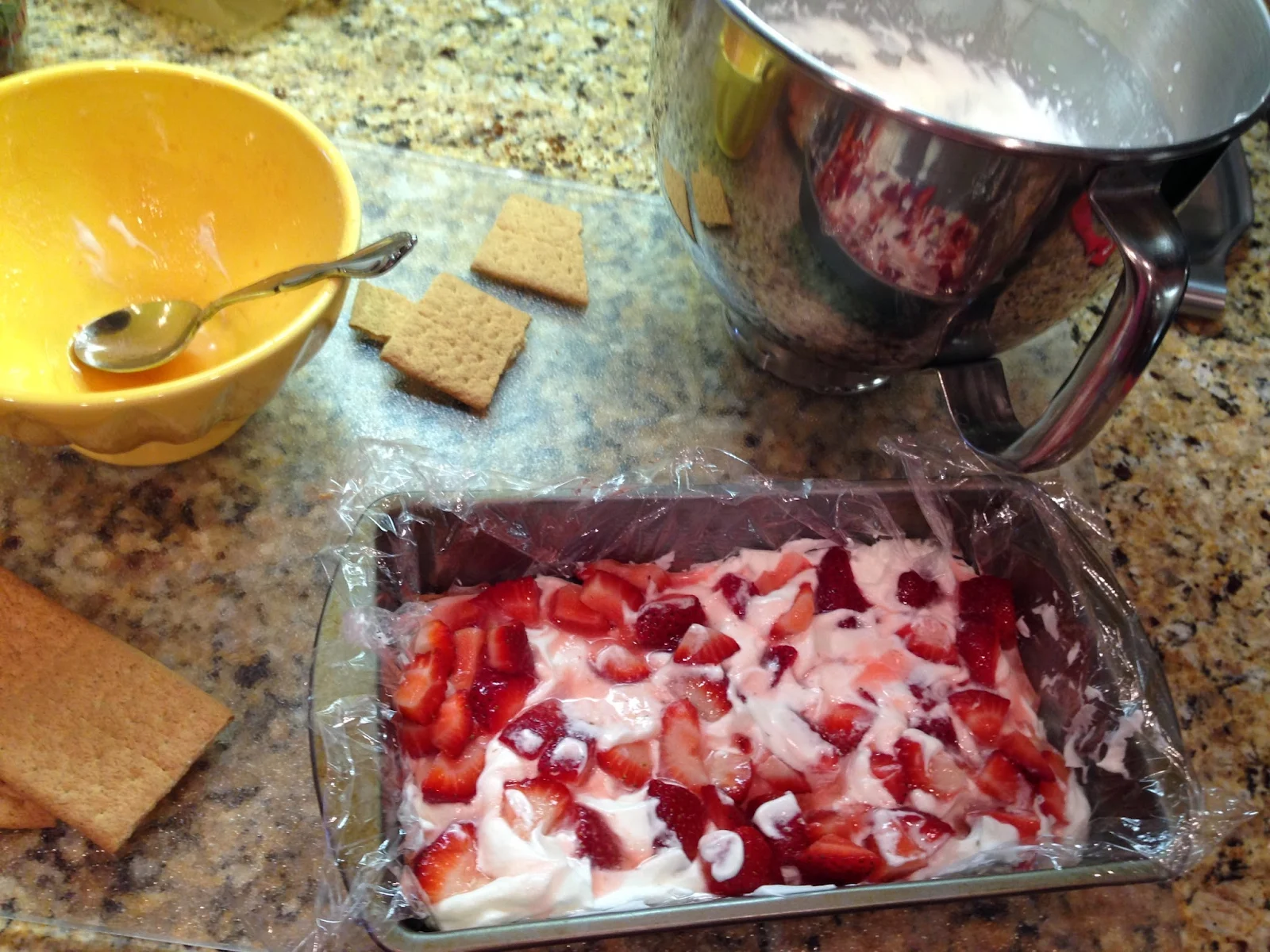 Line a loaf pan with plastic wrap. Layer 1/3 of whipped cream into dish. Spoon ½ of strawberries and half of juice on top of whipped cream, evenly. Top with a layer of graham crackers, breaking them if necessary to make them fit.
